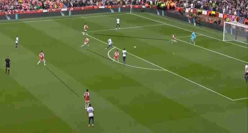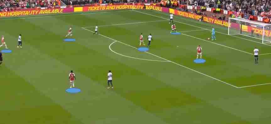 Quasi sempre i Gunners portano in zona rifinitura 5 calciatori che sono i 3 trequartisti, la punta e uno dei 2 terzini, più spesso Zinchenko rispetto a Tomiyasu. Si tende a cercare lo spazio tra le linee di centrocampo e difesa avversaria, molto abile in questo Odegaard.