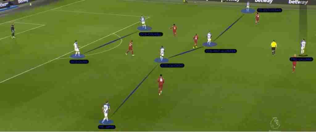 In genere nel Brighton, schierato in non possesso con il 4-4-2, Ferguson e Lallana cercano di schermare il passaggio per le vie centrali, e quando uno dei 2 esce forte sul portatore di palla, in genere un difensore, l’altro va a coprire la linea di passaggio sul play.