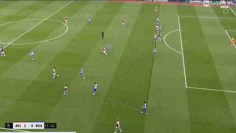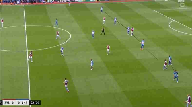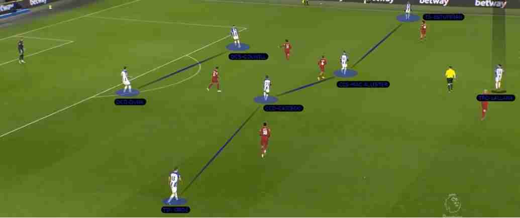 Nel caso del Brighton lo scopo è creare spazio alle spalle del centrocampo; in rifinitura si vengono a trovare Ferguson e Lallana che riescono a muoversi senza dare riferimenti ai difensori, e gli esterni larghi in ampiezza che sono March e Mitoma; per raggiungere la zona di rifinitura gli uomini di De Zerbi ricorrono a verticalizzazioni, cambi di gioco e cosiddette giocate a muro.