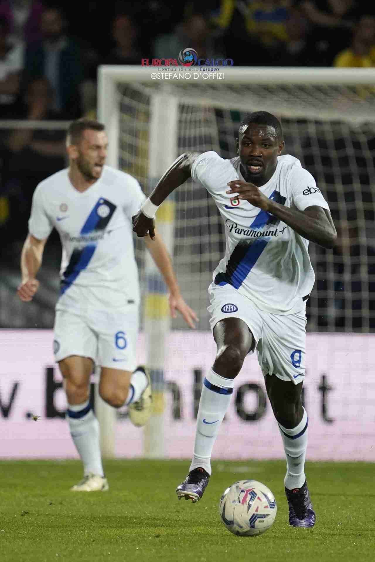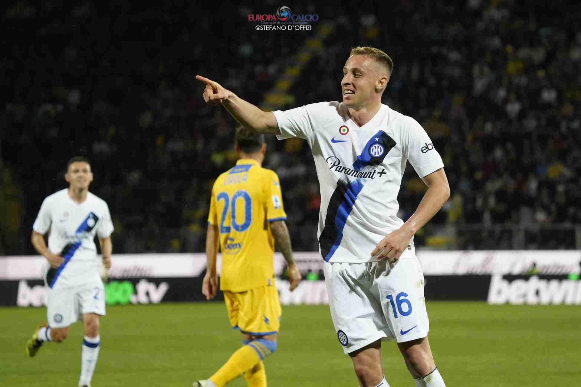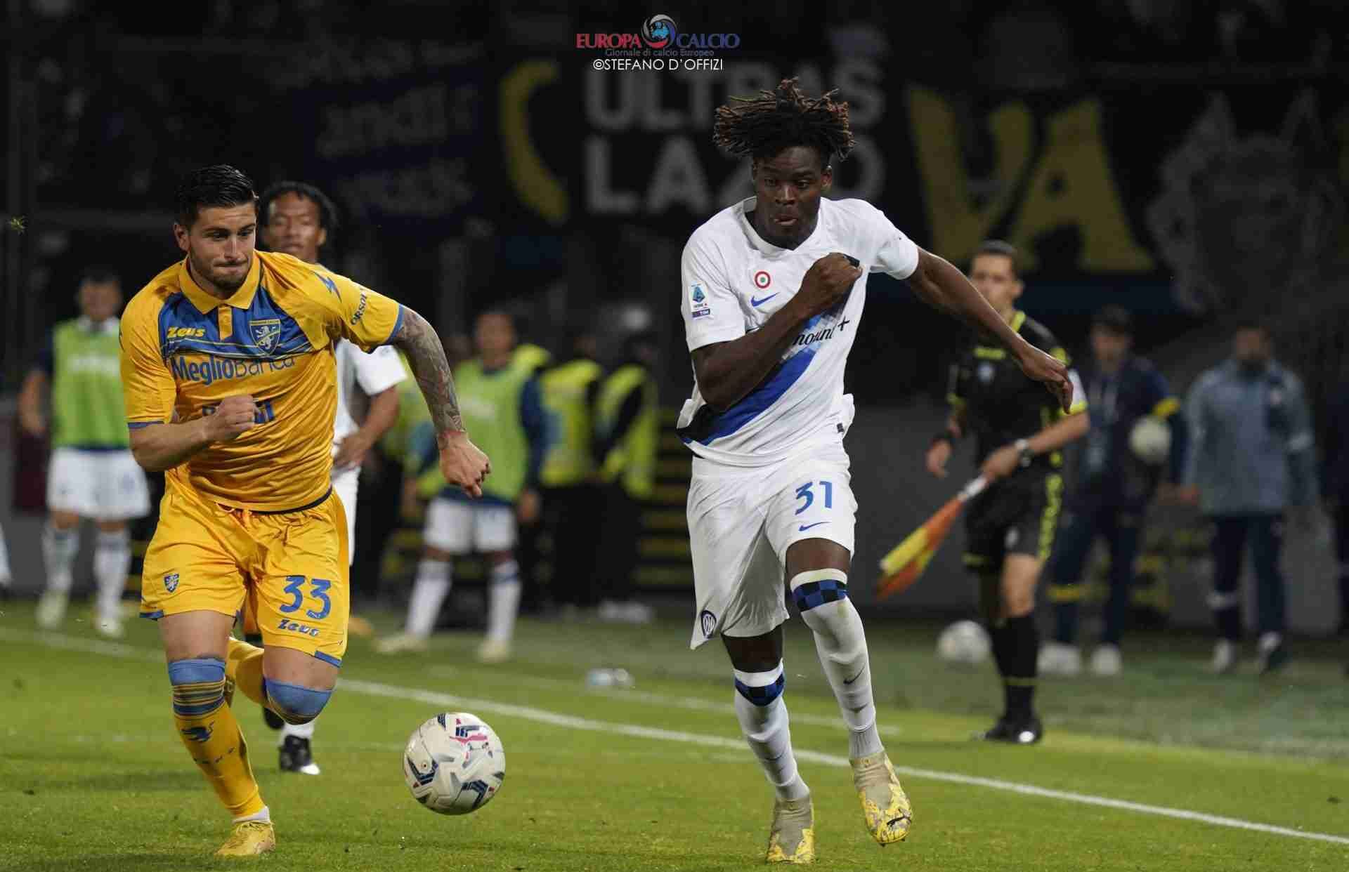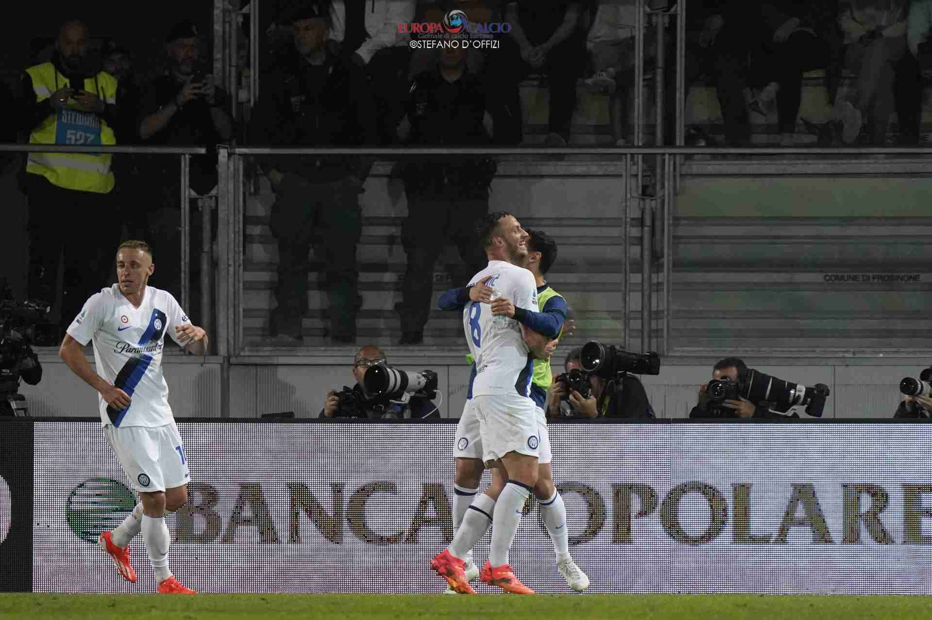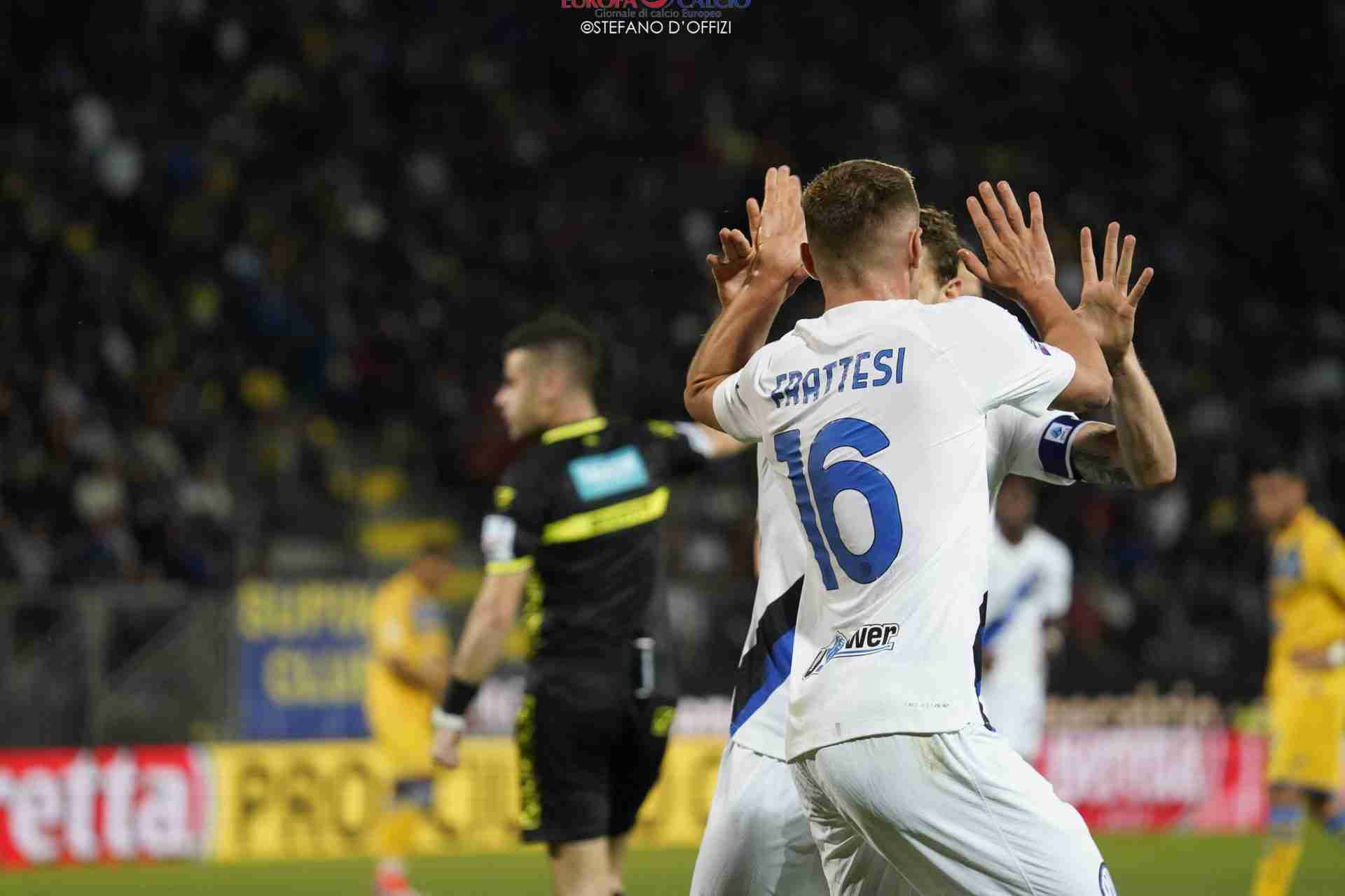 Nei primi minuti è il Frosinone ad attaccare, spingendo i campioni nella propria metà campo e bloccando le ripartenze, ma i nerazzurri questa stagione non ne hanno per nessuno, almeno in Italia. Proprio da una di queste ripartenze al minuto 19 giunge la rete del vantaggio ad opera di Frattesi che sfrutta un assist al bacio da parte di Thuram.