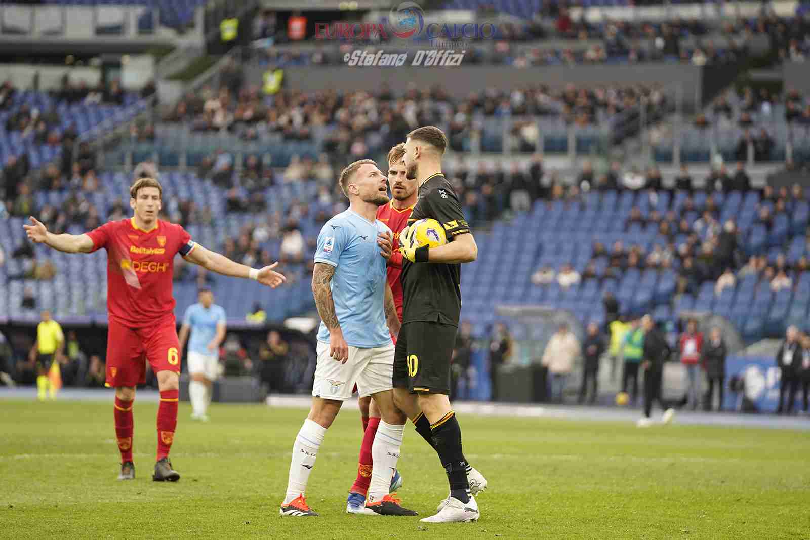 Maria Sole Ferrieri Caputi ha il suo bel da fare quando Immobile si scontra con Falcone nel tentativo di anticiparlo su un passaggio filtrante. Ne nasce una mischia poco simpatica in cui l’attaccante biancoceleste finisce a terra e si accende un capannello sedato in modo autorevole dall’arbitro che ha saputo tenere il polso per tutta la gara.