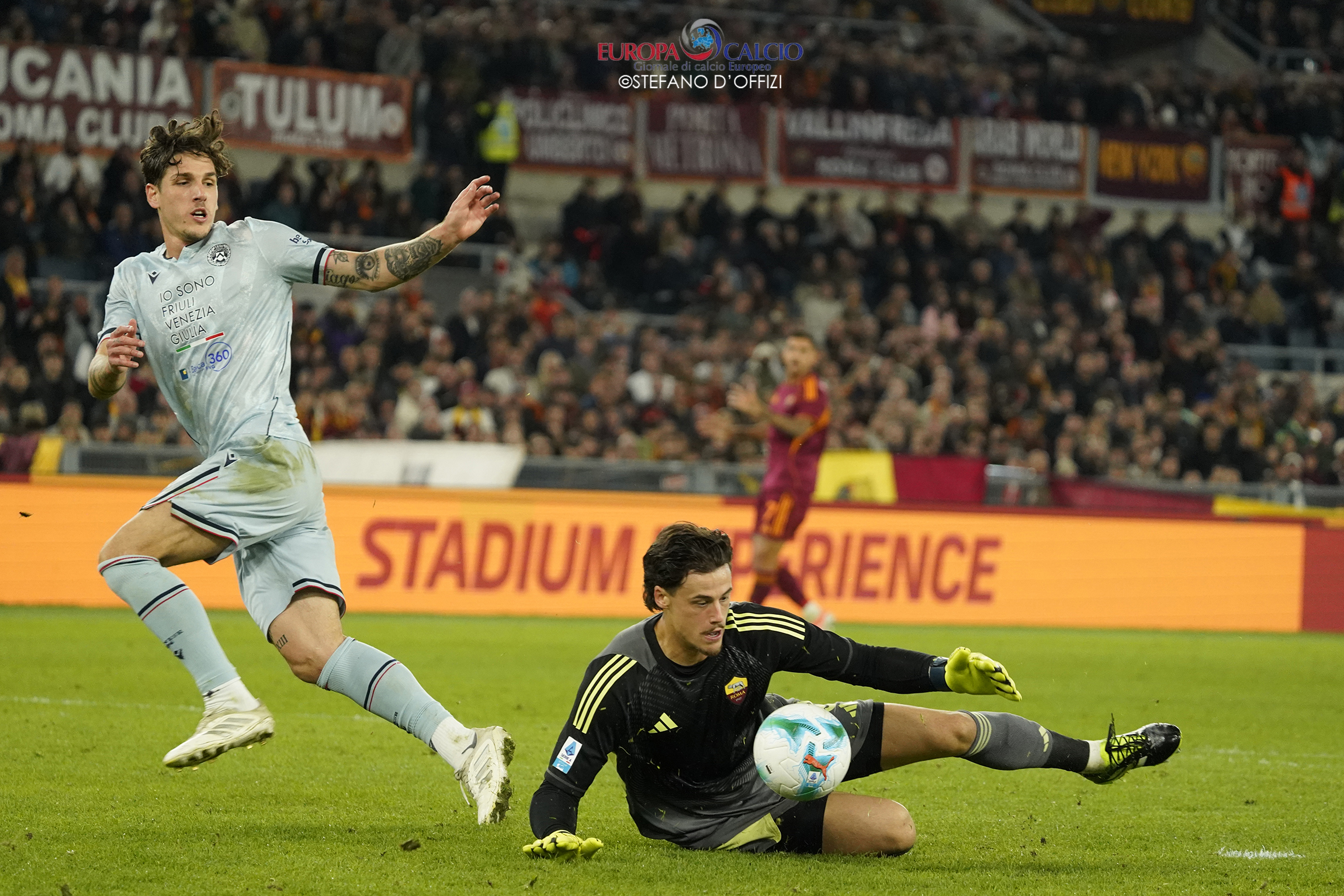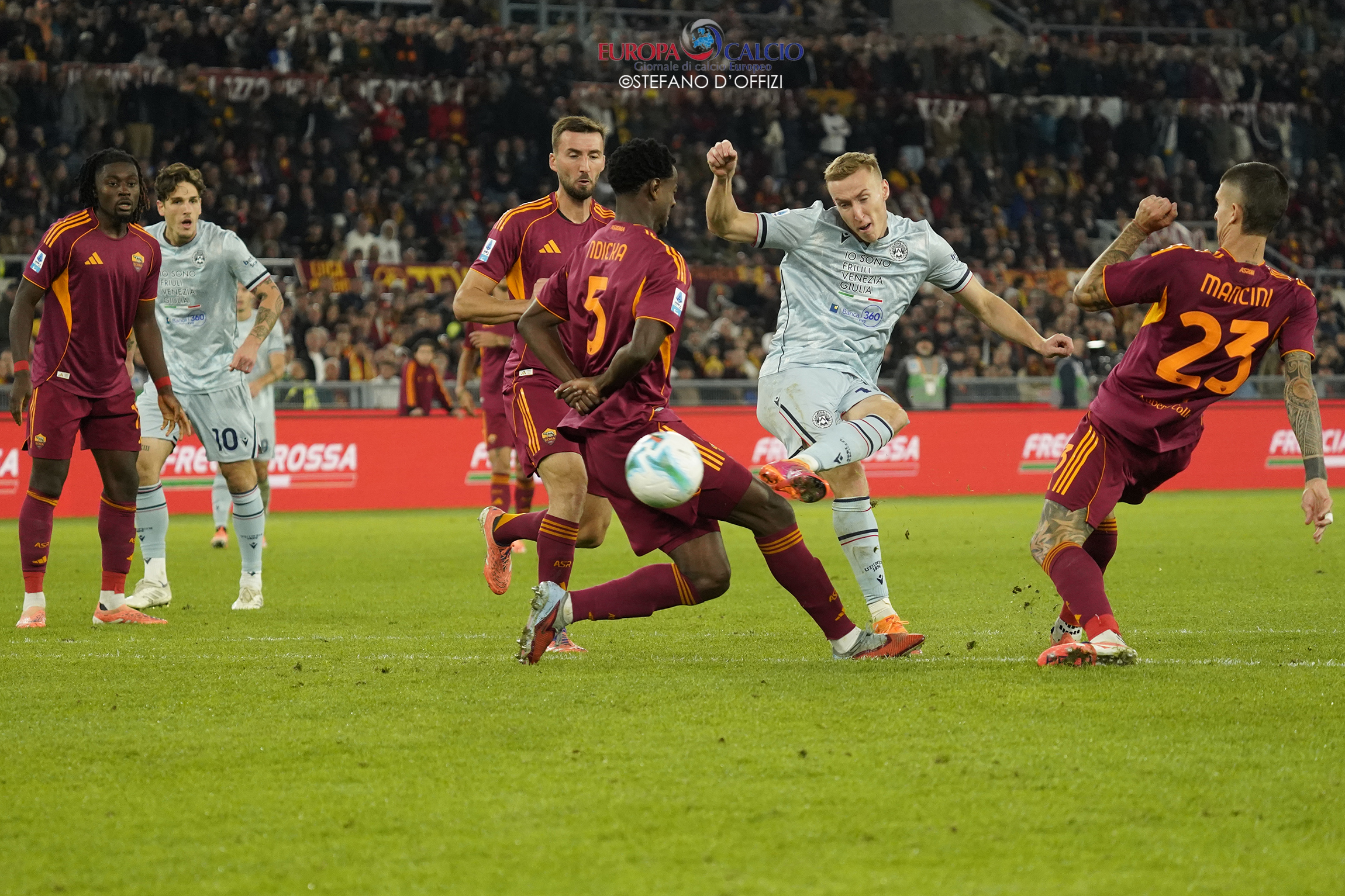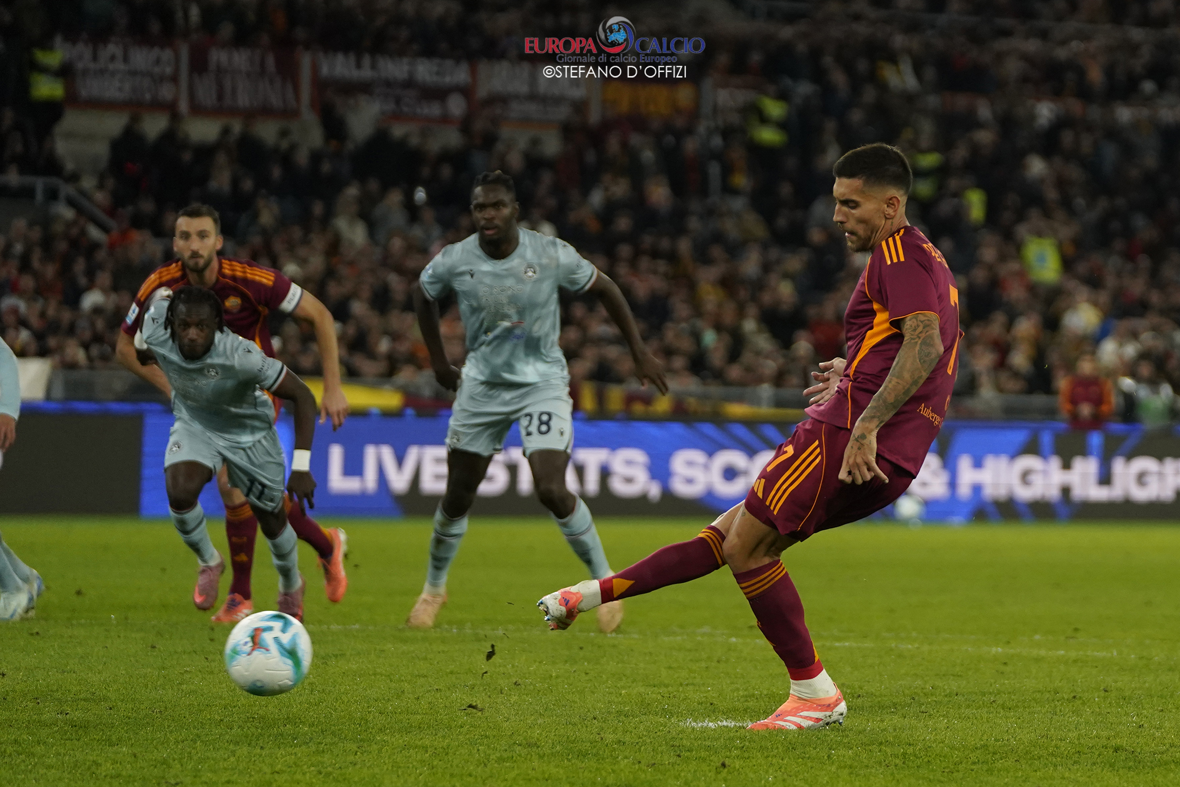 La squadra di Gian Piero Gasperini parte forte, domina il possesso e costringe gli ospiti nella propria metà campo. Al 41’, un fallo di mano in area friulana regala il rigore ai capitolini: dal dischetto Pellegrini non sbaglia, spiazzando il portiere e firmando l’1-0 che indirizza il match.